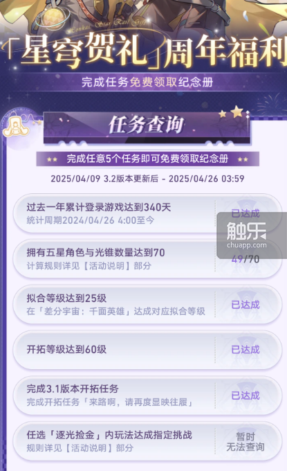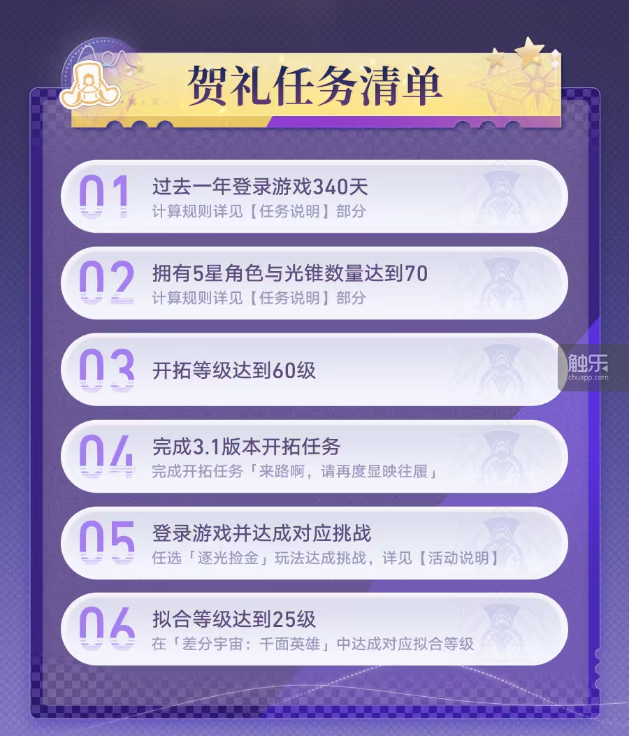 现实上,这些前提里只要2个选项有些门槛,那就是“近一年内登录逛戏340天”或“五星取光锥数量达到70”——相较而言,后者其实更像是避免部门玩家伴侣由于消费习惯而错失励的“补丁”。