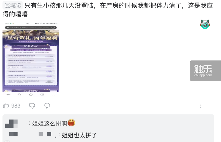 现实上,这也和我正在社区浏览到的环境相符:有相当一部门玩家的反映是“松了一口吻”。良多玩家发帖暗示,比拟“全勤”(自逛戏运营起每日登录、没有间断),过去1年里登录340天实正在不是过度苛刻的要求。终究对于他们来说,每天上线一小会儿《星铁》曾经成了习惯,全从动回合制的弄法脚够放松,不会给人带来太大压力。