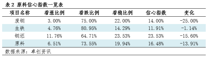 分品种来看,废钢决心指数为14。00,较上期降25。00;生铁决心指数为11。91,较上期降1。14;钢坯决心指数为23。53,