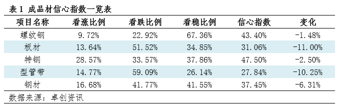 分品种来看,螺纹钢决心指数为43。40,较上期指数降1。48;板材决心指数为31。06,较上期指数降11。00;特钢决心指数为47。50,较上期指数降2。50;型管带决心指数为27。84,较上期降10。25。