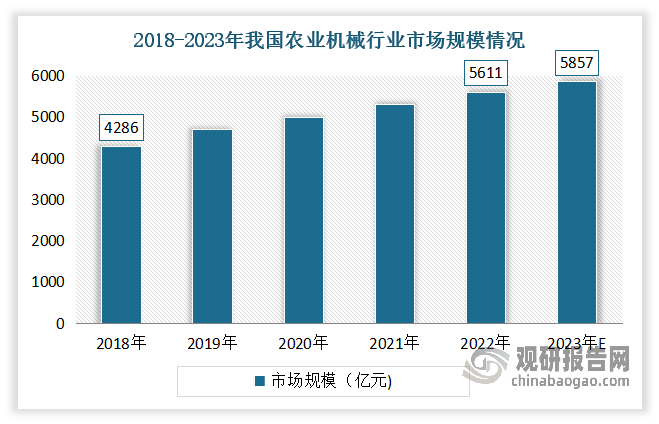 农业机械化是实现农业现代化和确保国度粮食平安不成或缺的物质根本,也是农业现代化的主要标记。当前正在我国处于从保守农业向现代农业改变的环节期间鄙人,对于提高农业配备先辈性、改善农业出产前提、加强农业分析出产能力和拉动农村消费需求具有主要意义。近年来正在《农业机械化推进法》、农机购买补助等一系列搀扶政策推进下,我国农业机械化取得了快速成长,实现质的飞跃,不只无效鞭策了国内农机配备程度和农业机械化程度的提拔,并且还支持农业各财产成长的机械化根本逐渐安稳。具体如下:市场不竭扩大。数据显示,2018-2022年我国农业机械行业市场规模由4286亿元增加至5611亿元,估量2023年我国农业机械市场规模将正在5857亿元摆布。